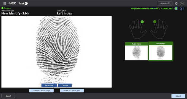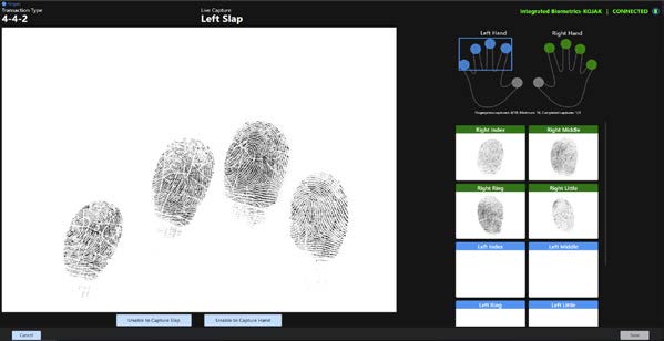 FastID provides finger, face, and iris support in a lightweight web app enabling rapid, accurate biometric identification or verification. Fully configurable capture sequences enable agencies to implement secure identification or verification for any desired purpose.
